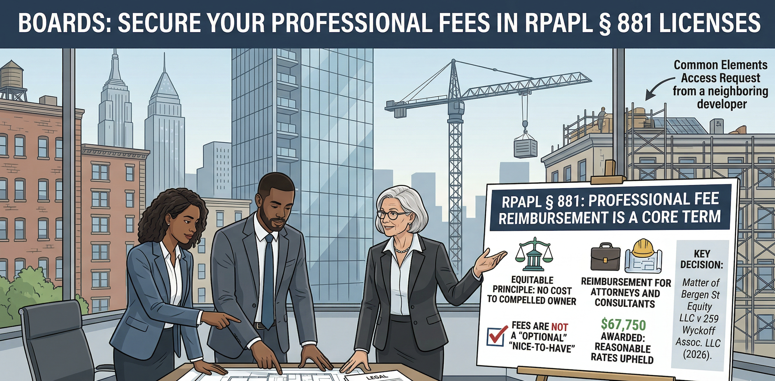 Boards and managers of condominiums, cooperatives, and homeowners associations (HOAs) in New York are increasingly confronted with requests from neighboring owners and developers for temporary access to building exteriors, roofs, yards, setbacks, and other common elements to perform construction, repairs, or protective work.. When access is necessary and consent is withheld, the requesting party may seek a court-ordered license under Real Property Actions and Proceedings Law (RPAPL) § 881. The decision in Matter of Bergen St Equity LLC v 259 Wyckoff Assoc. LLC, 2026 N.Y. Misc. LEXIS 2552 (2026) is a useful reminder that, in RPAPL § 881 practice, reimbursement of the adjoining owner’s reasonable professional fees is not a “nice-to-have”-it is frequently treated as a central term of a fair license.